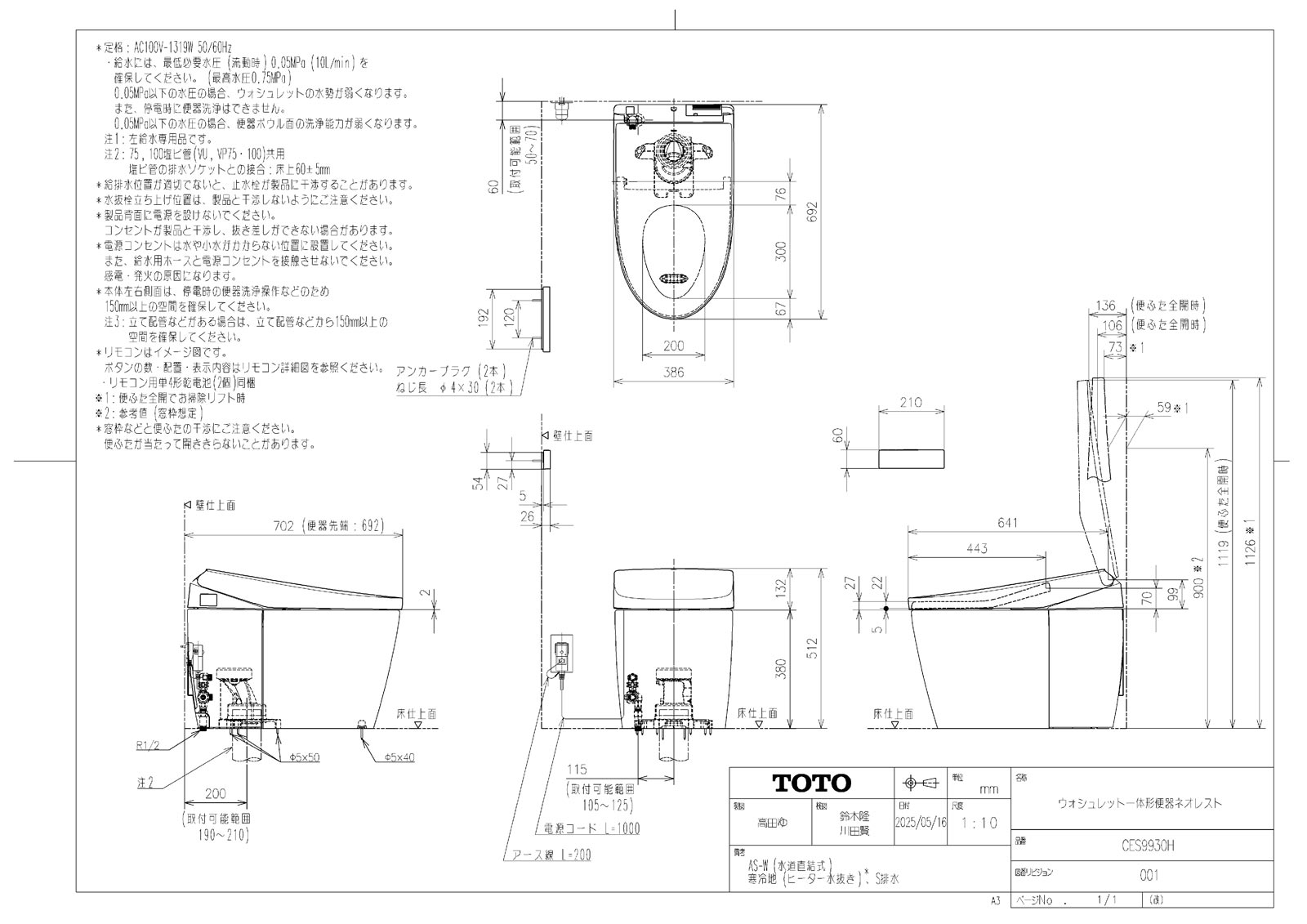 ネオレスト AS-W 寒冷地 床給水 床排水 200mm 標準リモコン