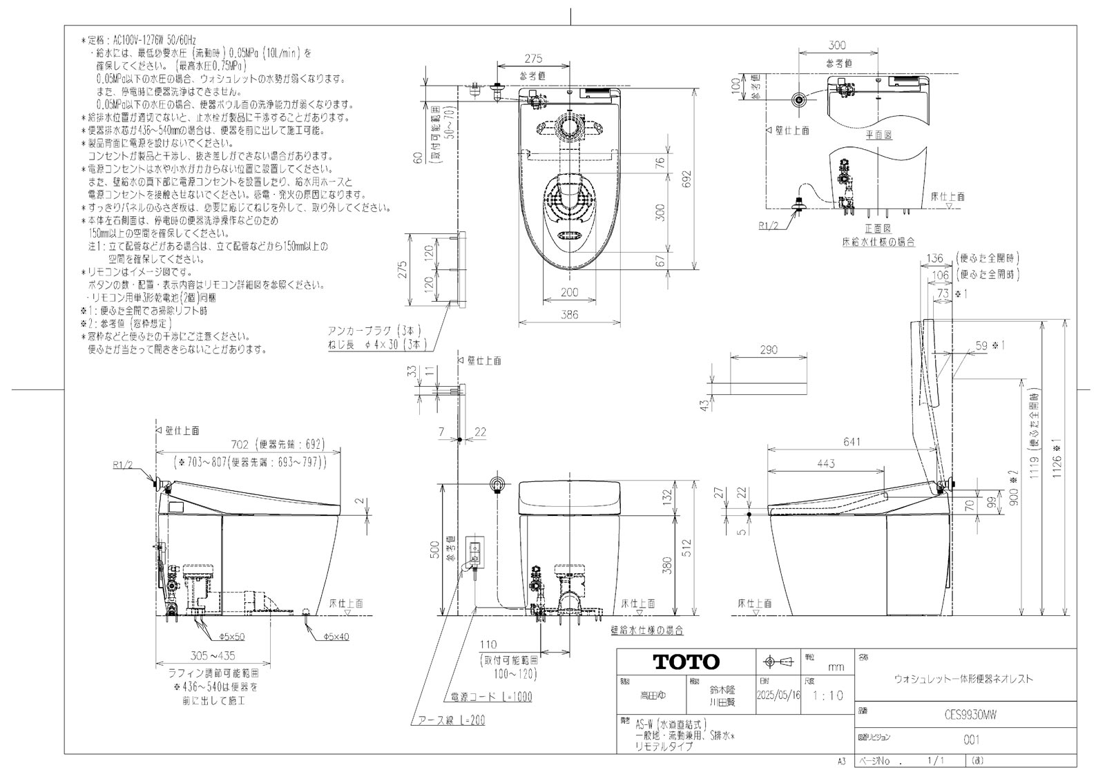 ネオレスト AS-W 一般地 壁床共通給水 床排水 リモデル対応305-540mm スティックリモコン