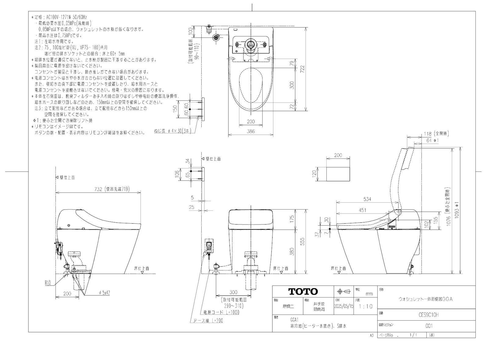 ウォシュレット一体形便器GGA1 寒冷地 床給水 床排水 排水芯200mm