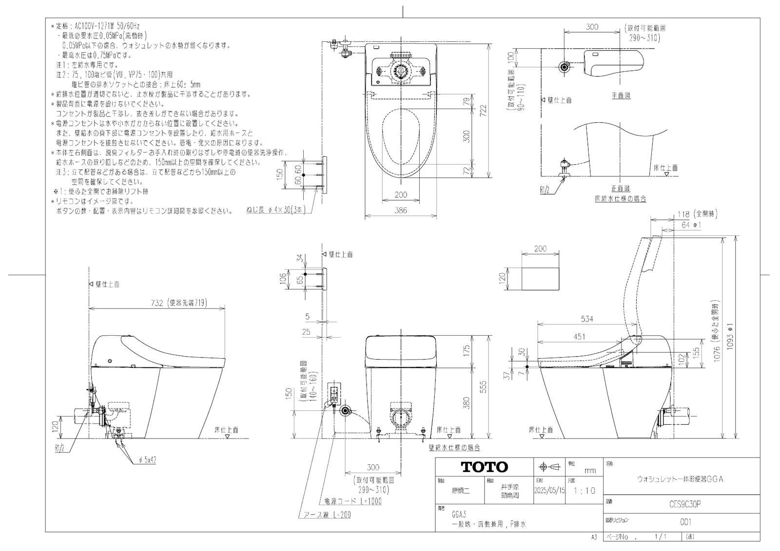 ウォシュレット一体形便器GGA3 一般地 壁床共通給水 壁排水 排水芯120mm