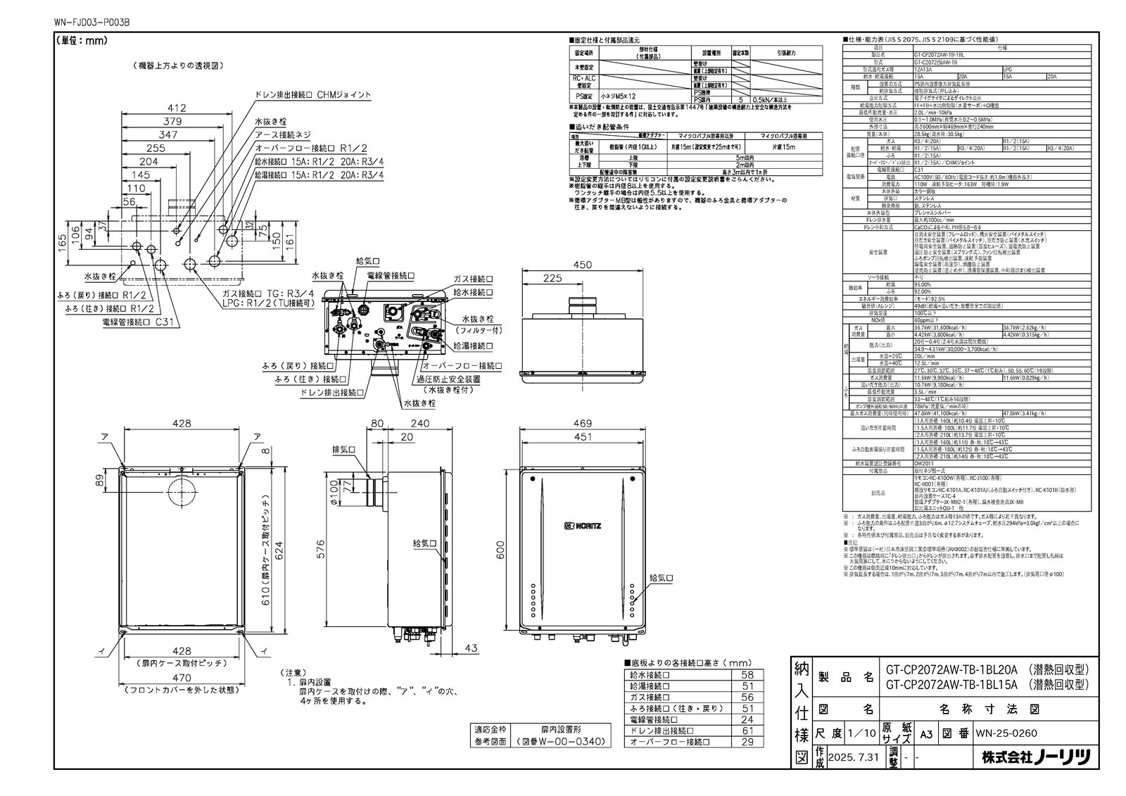 ガスふろ給湯器 ドレンアップ方式 20号 エコジョーズ PS扉内後方排気型 フルオート BL認定品
