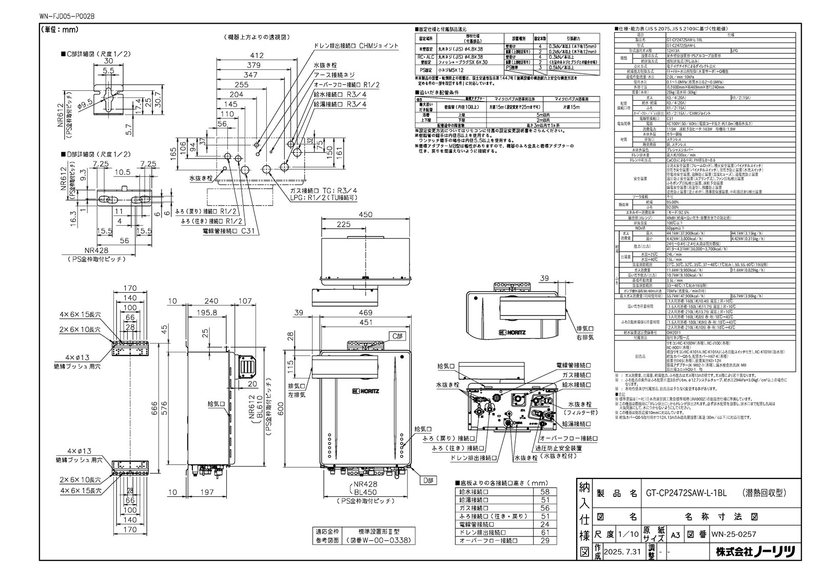 ガスふろ給湯器 ドレンアップ方式 24号 アルコーブ設置形 エコジョーズ オート BL認定品