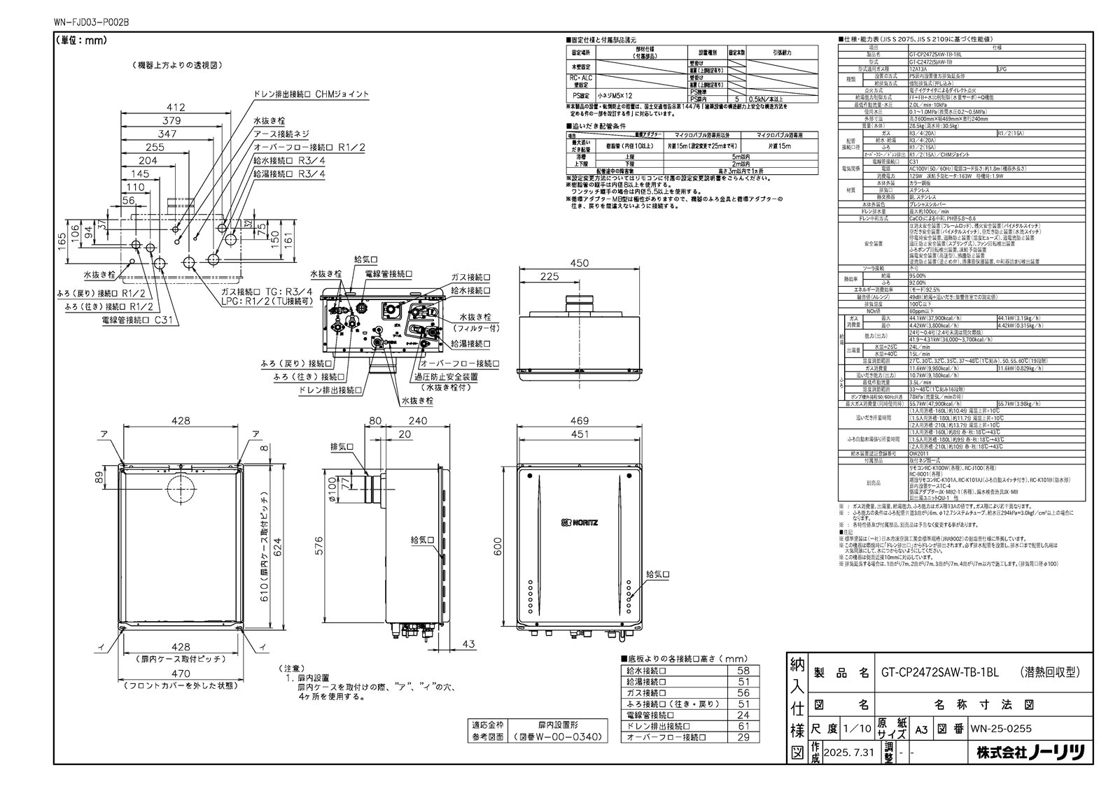 ガスふろ給湯器 ドレンアップ方式 24号 エコジョーズ PS扉内後方排気型 オート BL認定品