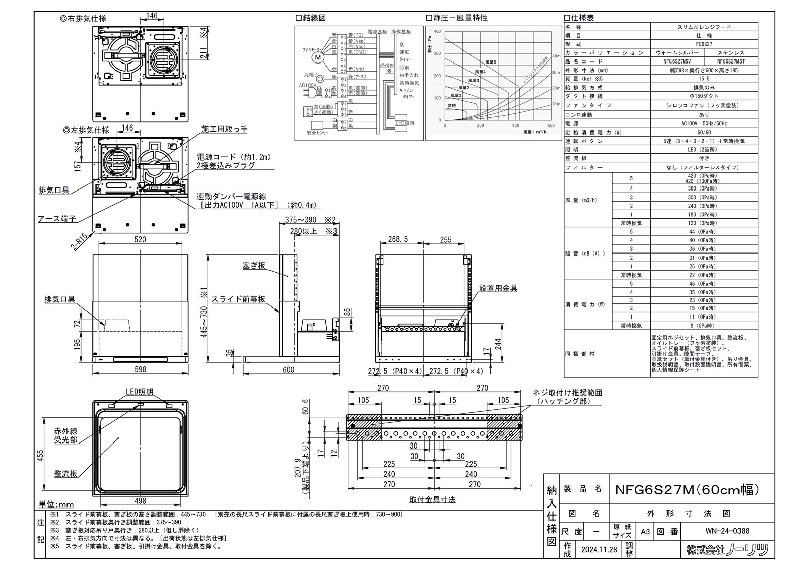 レンジフード クララタッチ スリム型ノンフィルター 60cm ステンレス