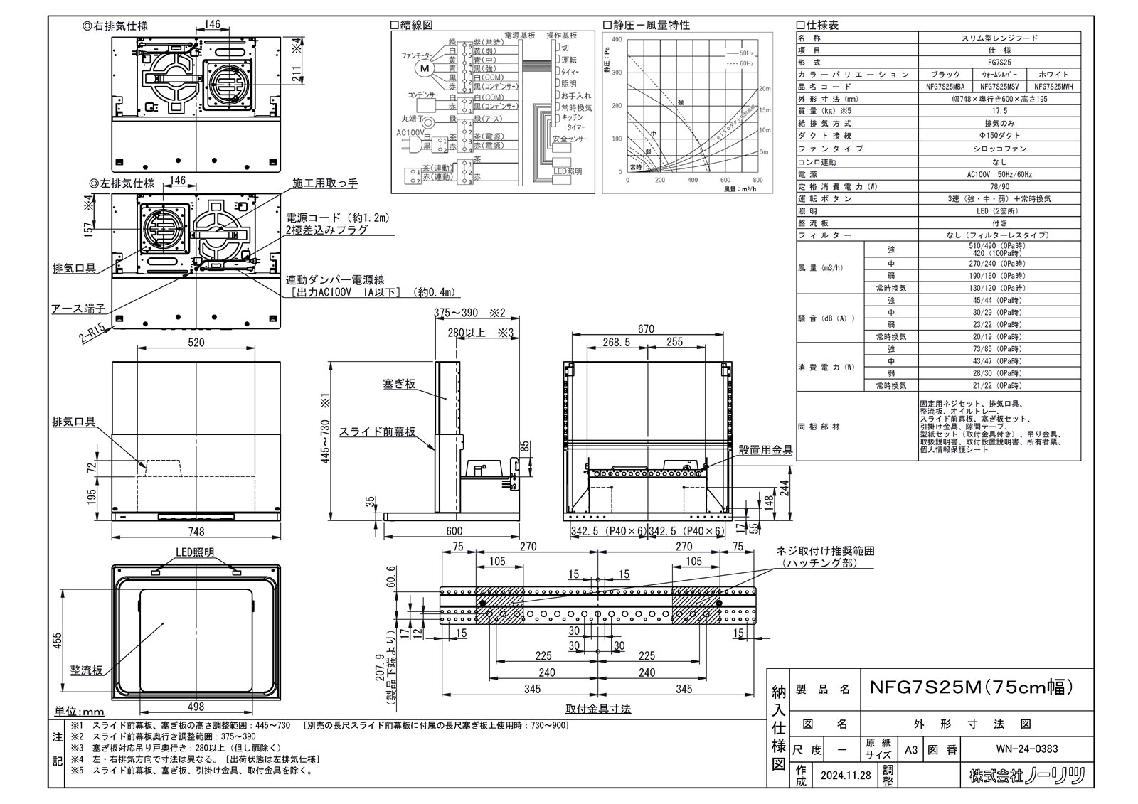 レンジフード クララ スリム型ノンフィルター 75cm ブラック