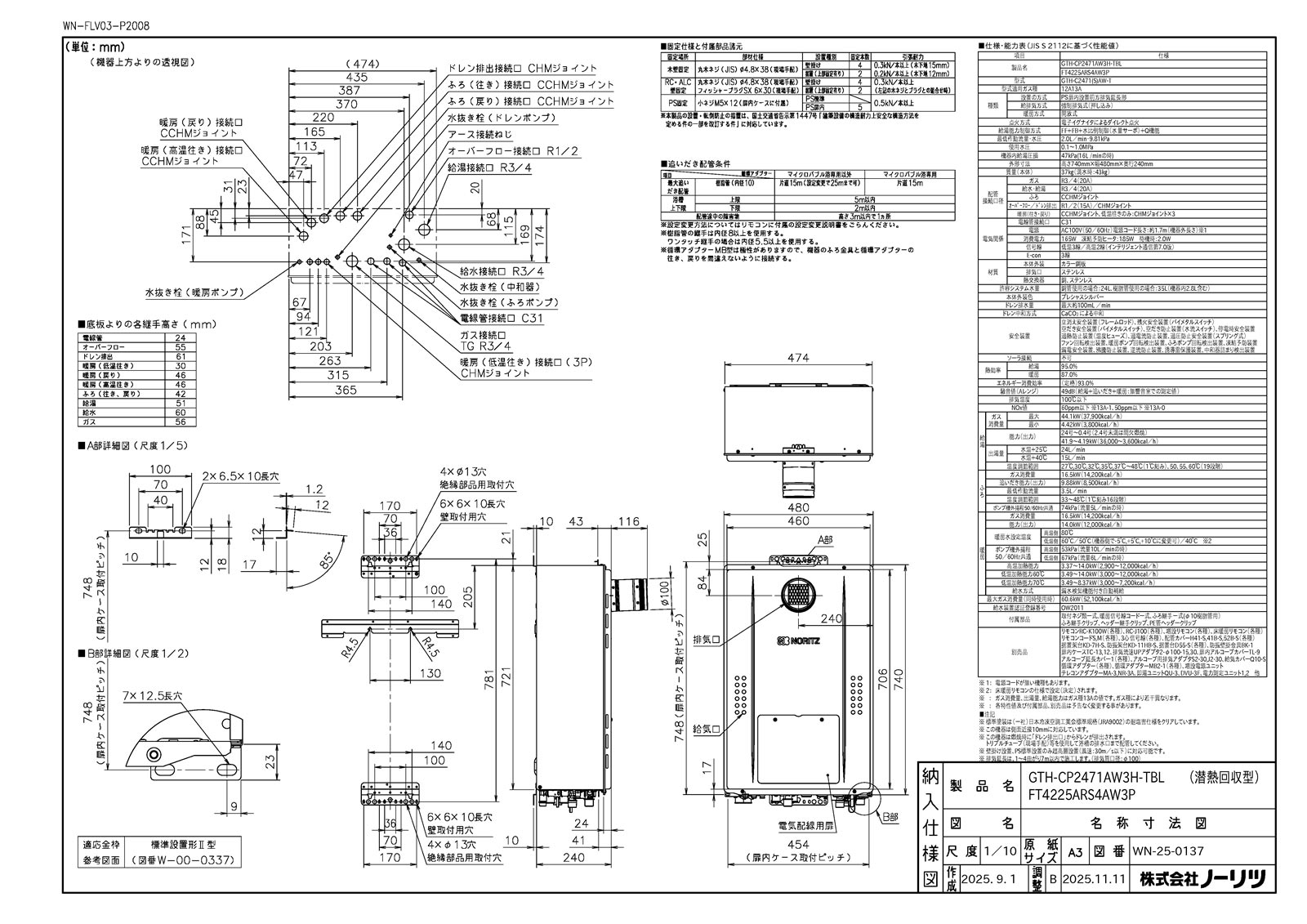 ガスふろ給湯暖房用熱源機 ドレンアップ方式 エコジョーズ 24号 フルオート PS扉内設置形(超高層対応) 2温度3P内蔵