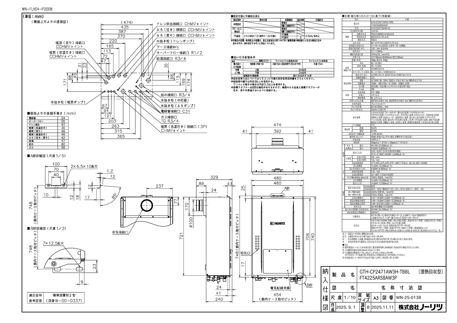 ガスふろ給湯暖房用熱源機 ドレンアップ方式 エコジョーズ 24号 フルオート PS扉内後方排気延長形 2温度3P内蔵
