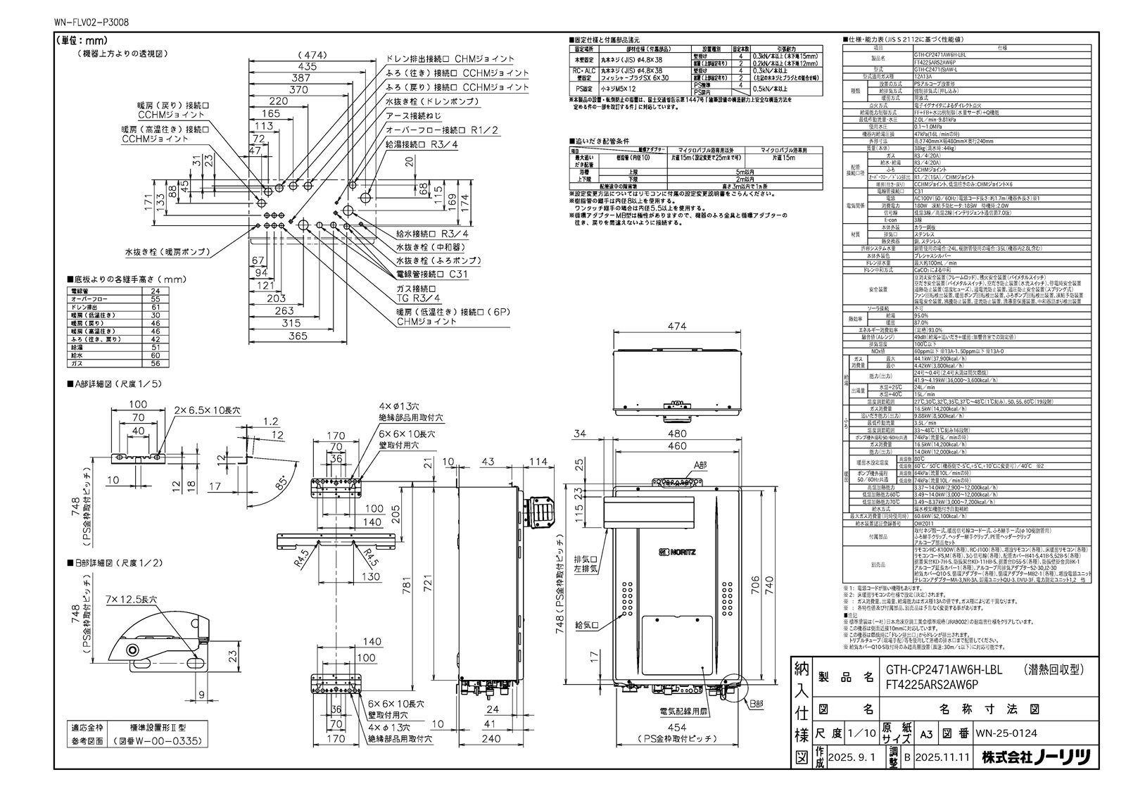 ガスふろ給湯暖房用熱源機 ドレンアップ方式 エコジョーズ 24号 フルオート PSアルコーブ設置形(超高層対応) 2温度6P内蔵