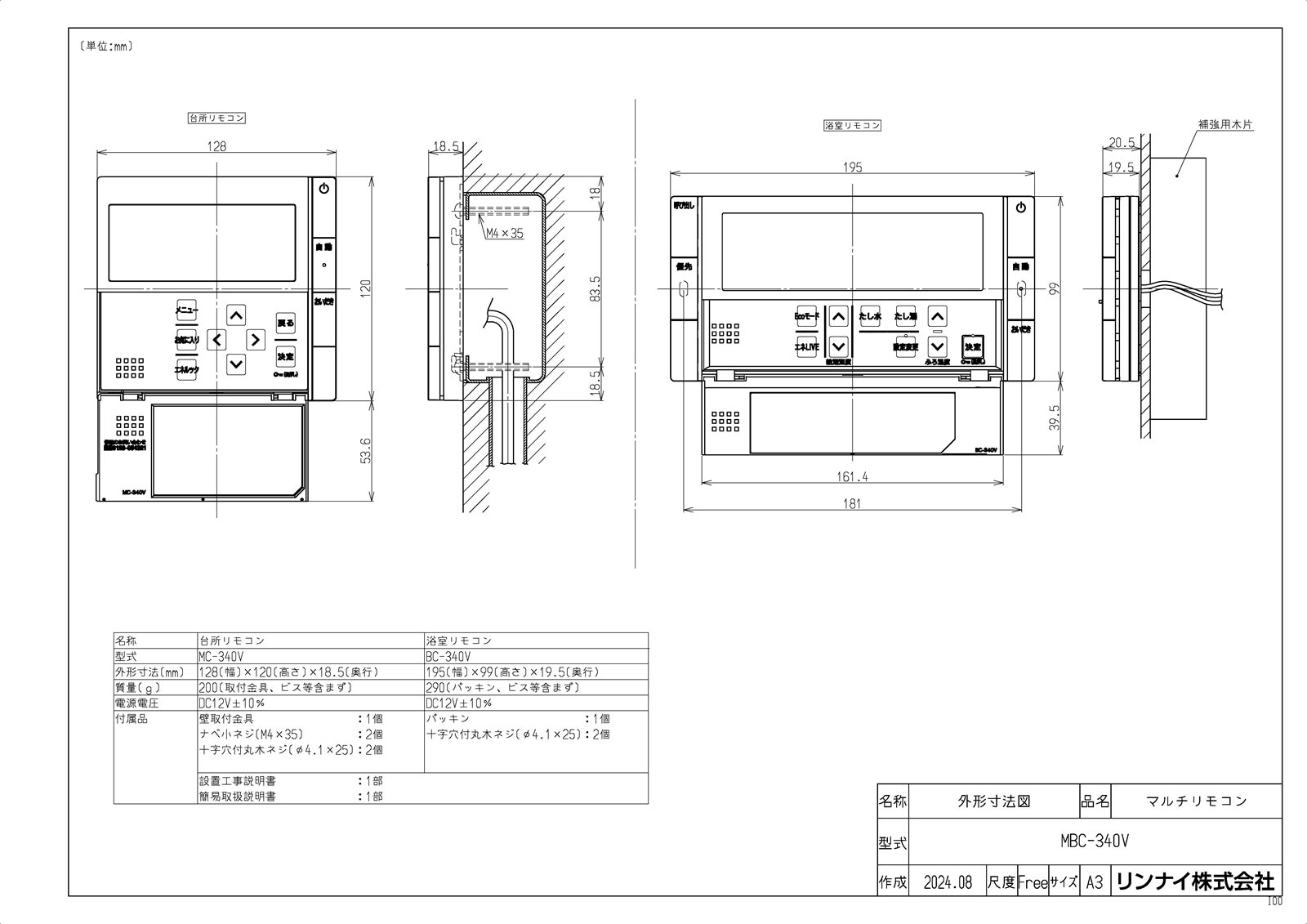 付属部品:台所リモコン:壁取付金具:1個 ナベ小ネジ(M4×35):2個