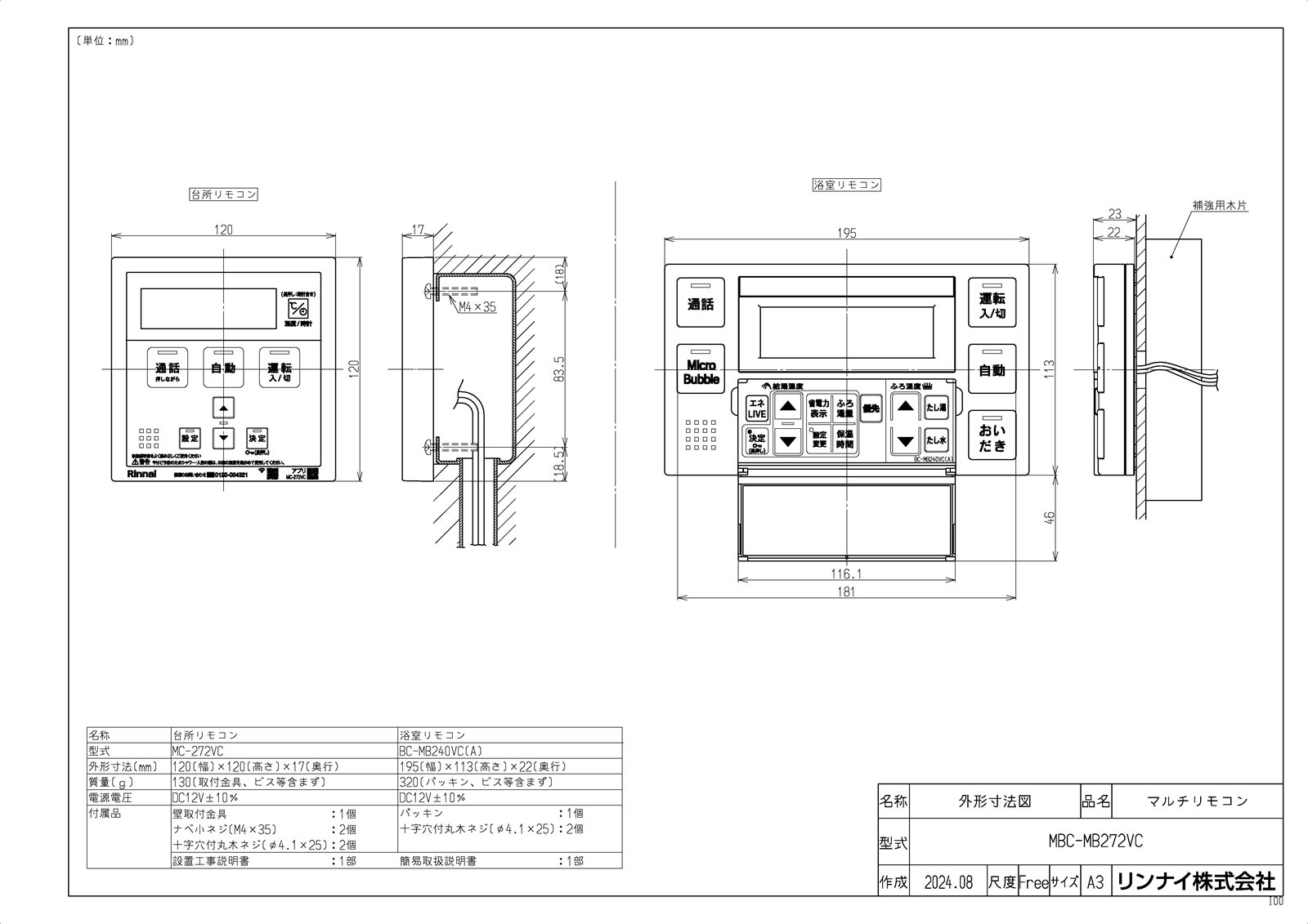 付属部品:台所リモコン:壁取付金具:1個 ナベ小ネジ(M4×35):2個