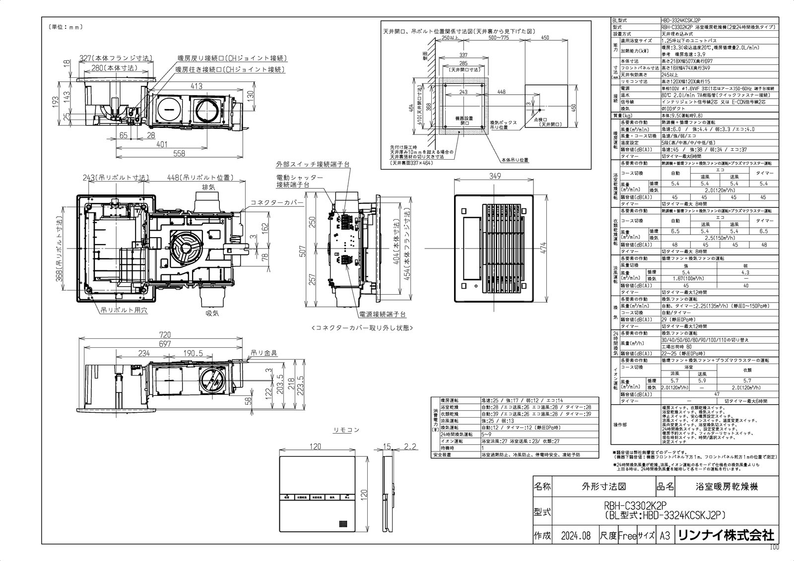 付属部品:ワイヤードリモコン(脱衣室)、リモコン取付ねじ、クッションゴム、取扱説明書(保証書付)、工事説明書、専用接続コード(脱衣室リモコン)5m、他
