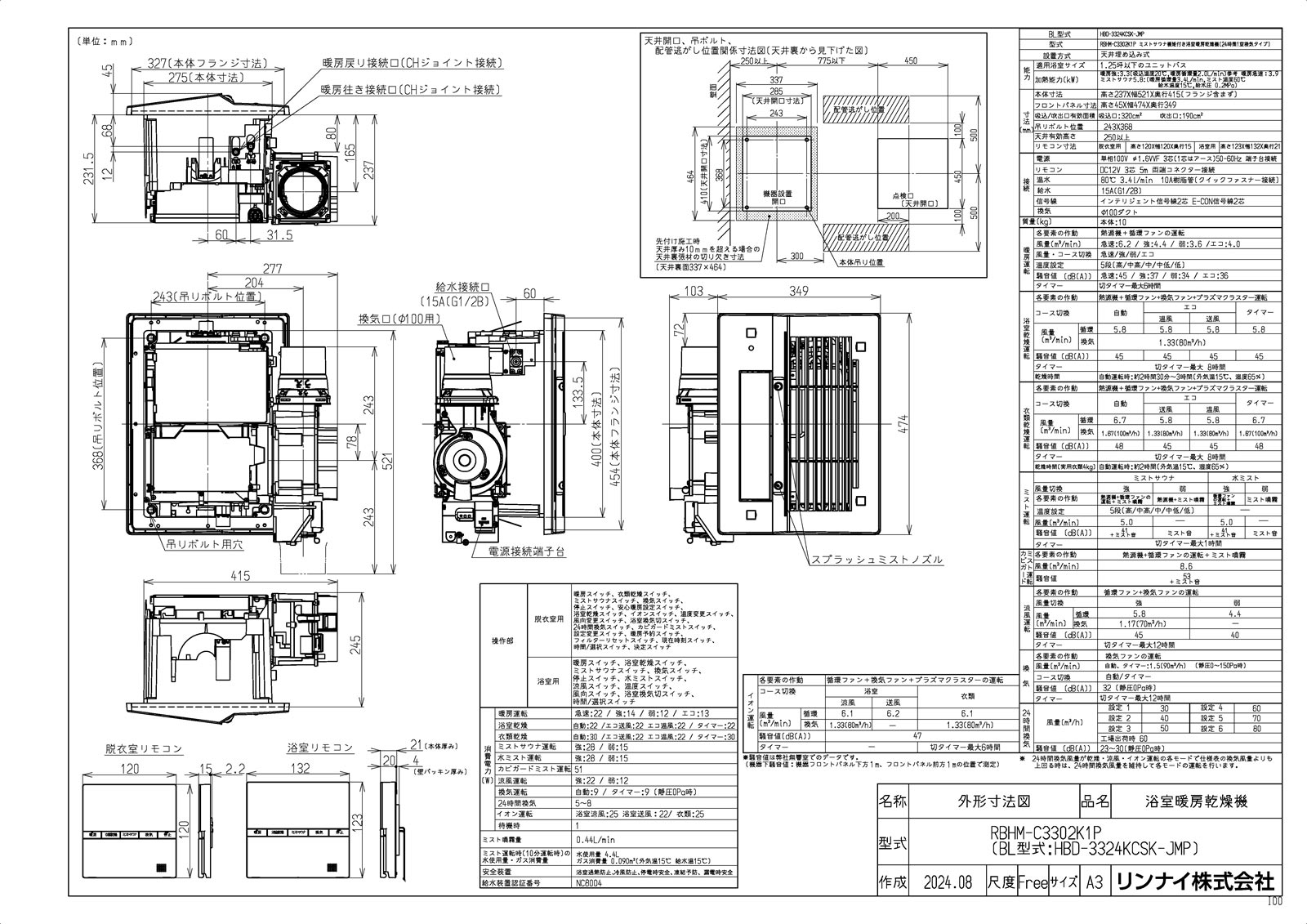 付属部品:ワイヤードリモコン(脱衣室・浴室)、リモコン取付ねじ、クッションゴム、取扱説明書(保証書付)、工事説明書、専用接続コード(脱衣室リモコン・浴室リモコン)5m、他