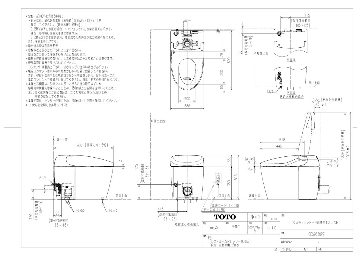 ウォシュレット一体形便器 ネオレスト RS3 レストルームドレッサー専用 壁排水 排水芯120mm