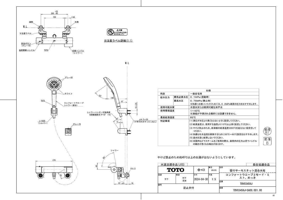 品名:壁付サーモスタット混合水栓(コンフォートウエーブ3モード・ミスト、めっき)