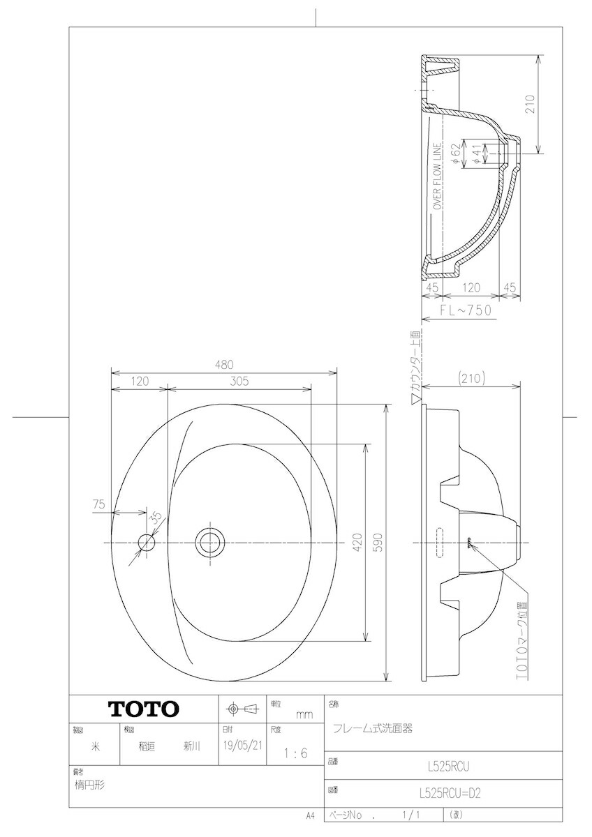 カウンター式洗面器 はめ込楕円形洗面器 フレーム式