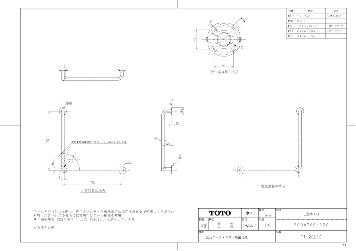 パブリック用手すり 樹脂被覆タイプ Φ34 腰掛便器用手すり 固定式 L型 R/L兼用:前出寸法120mm