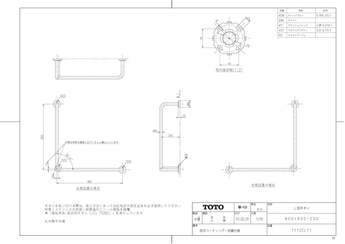 パブリック用手すり 樹脂被覆タイプ Φ34 腰掛便器用手すり 固定式 L型 R/L兼用:前出寸法230mm 800mm