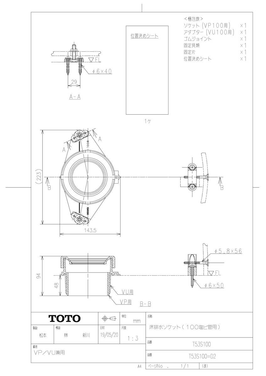 床排水ソケット(100塩ビ管用)