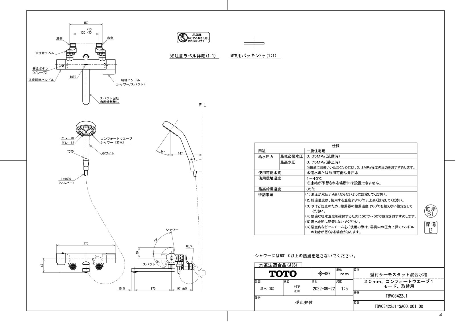 品名:壁付サーモスタット混合水栓(20mm、コンフォートウエーブ1モード、取替用)