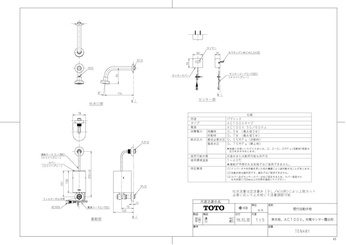 壁付自動水栓(単水栓、AC100V、光電センサー露出形)