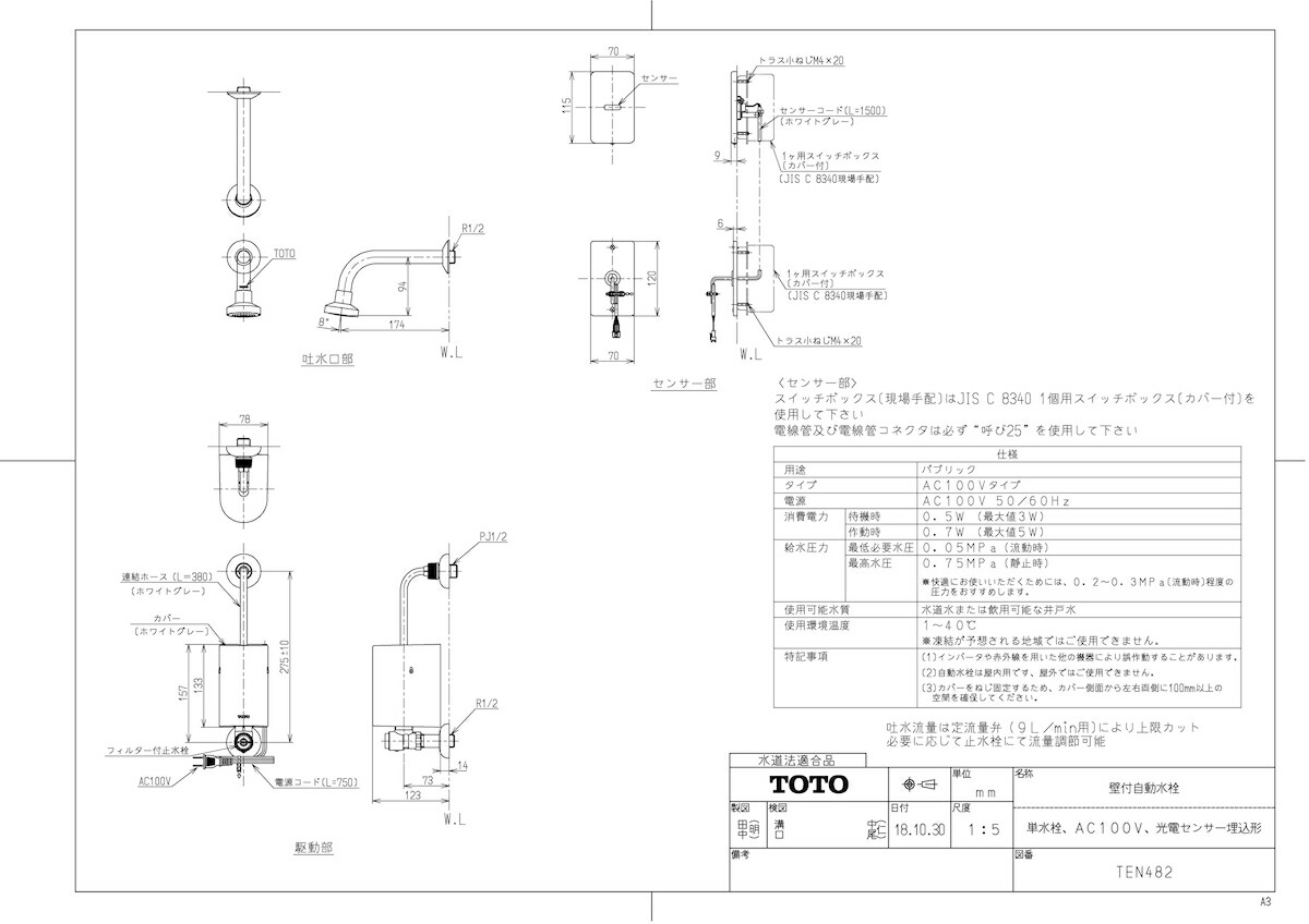 壁付自動水栓(単水栓、AC100V、光電センサー埋込形)