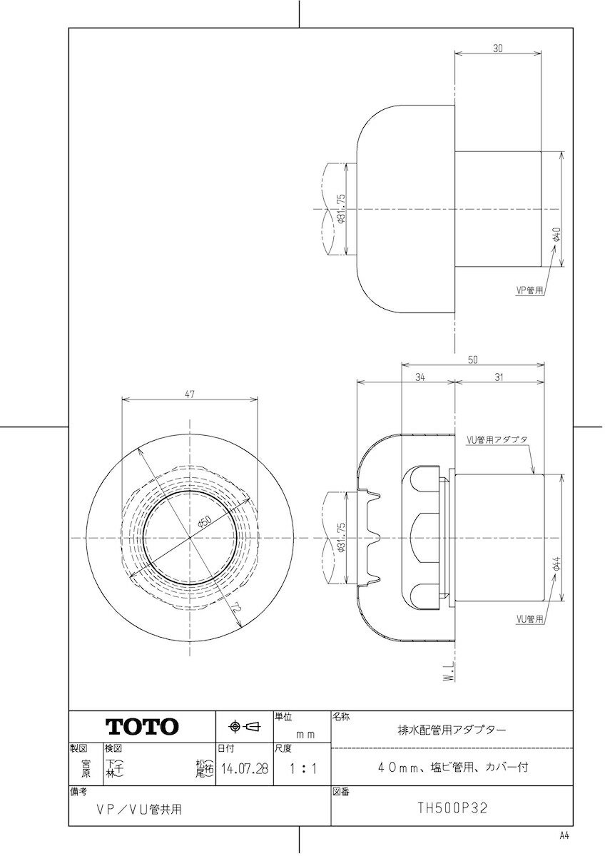 品名:排水配管用アダプター(40mm、塩ビ管用、カバー付)