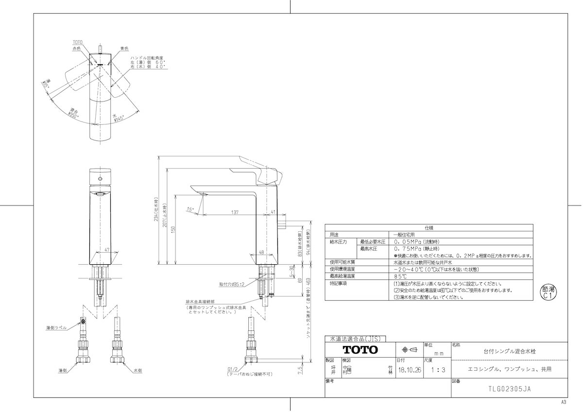 品名:台付シングル混合水栓(エコシングル、ワンプッシュ、共用)