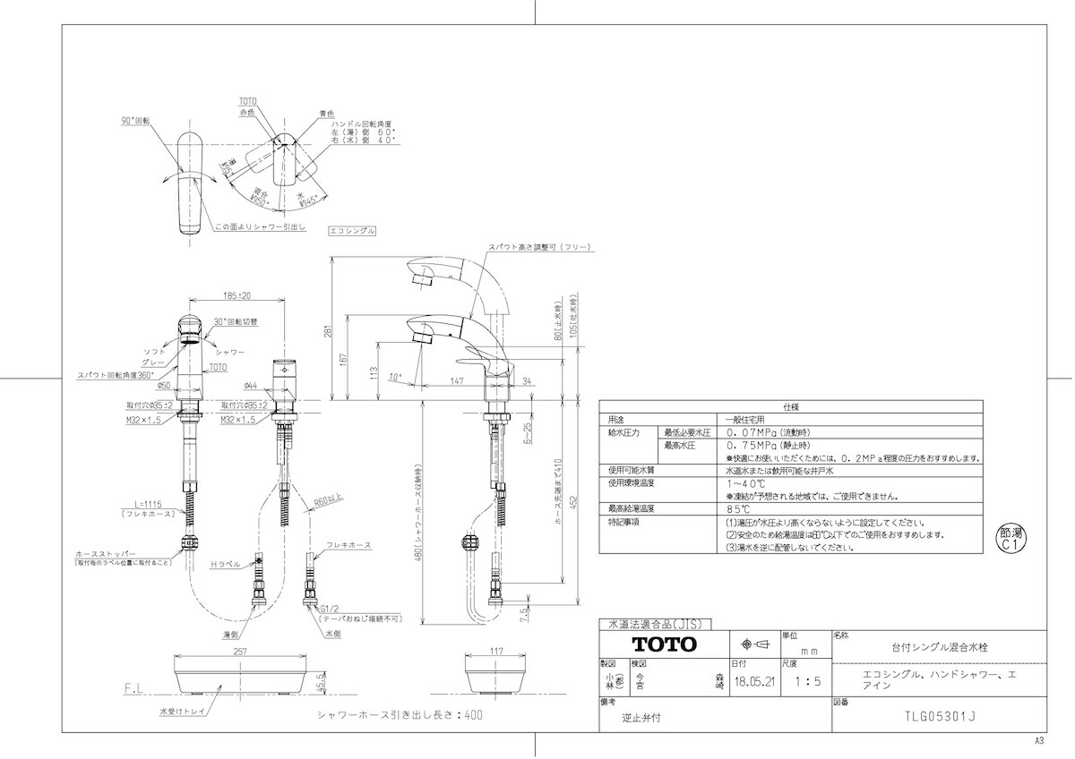 台付シングル混合水栓(エコシングル、ハンドシャワー、エアイン) 一般