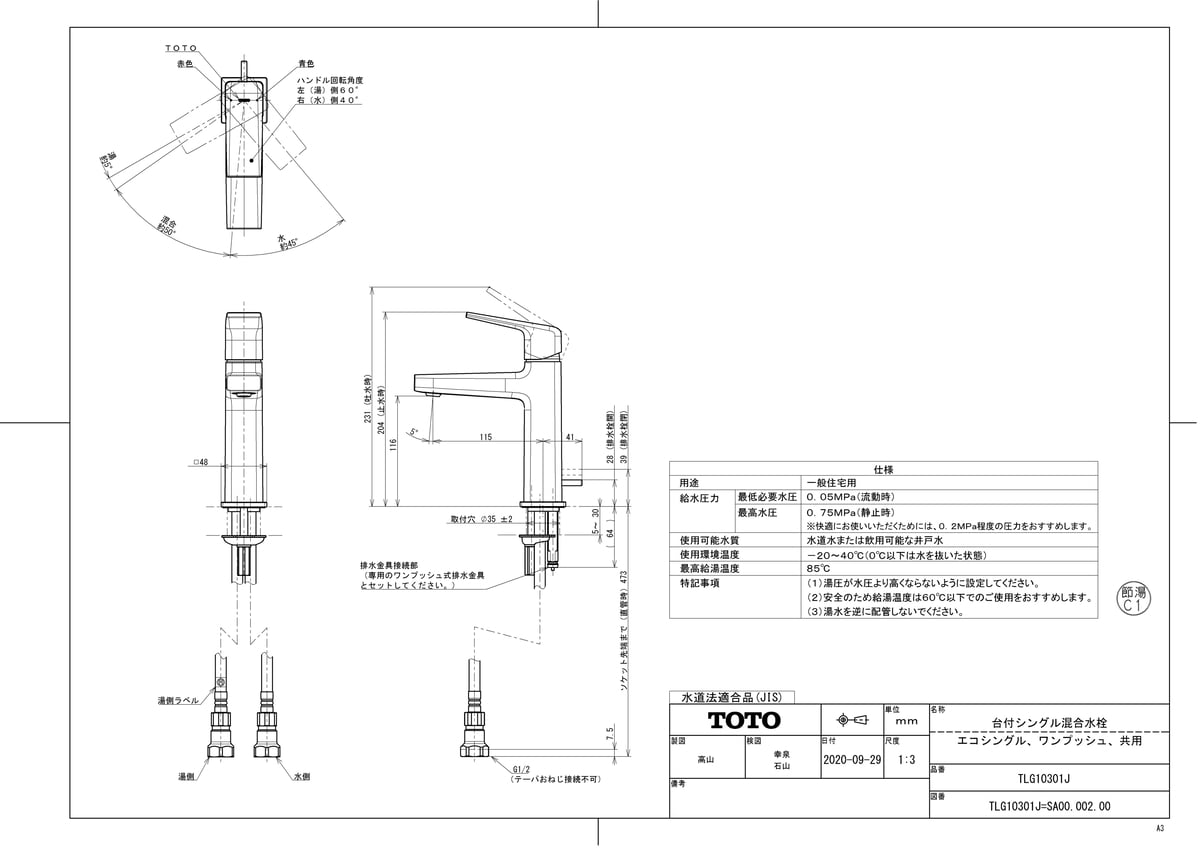 台付シングル混合水栓(エコシングル、ワンプッシュ、共用)