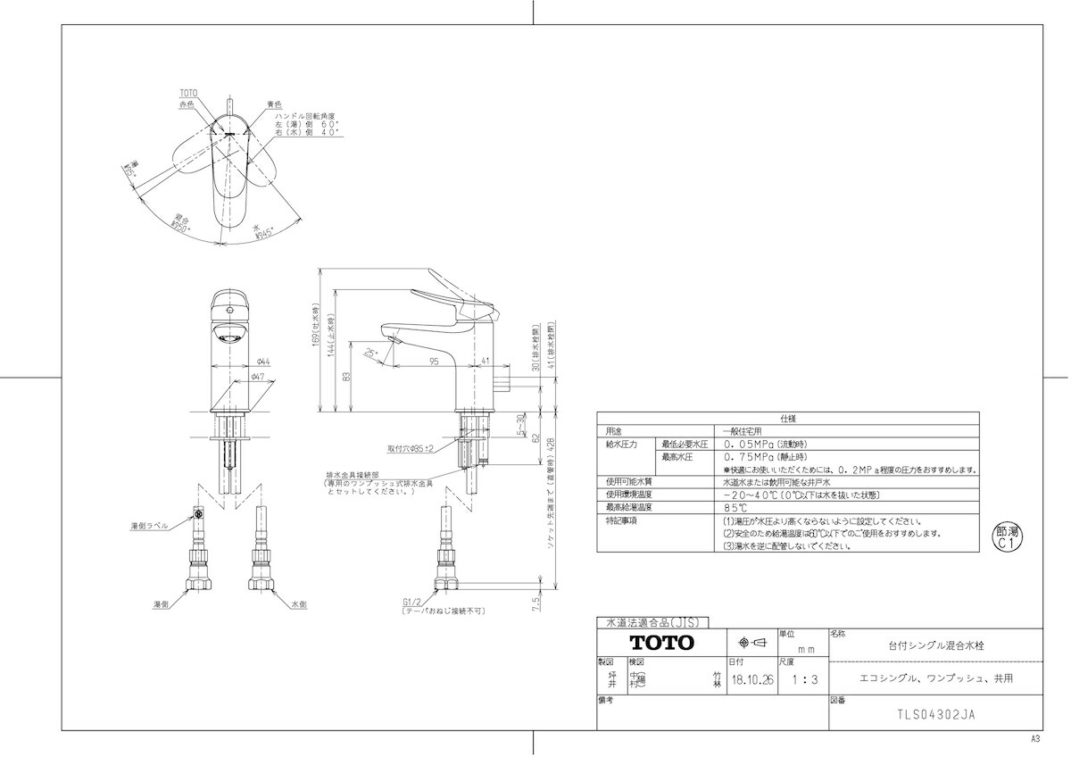 品名:台付シングル混合水栓(エコシングル、ワンプッシュ、共用)